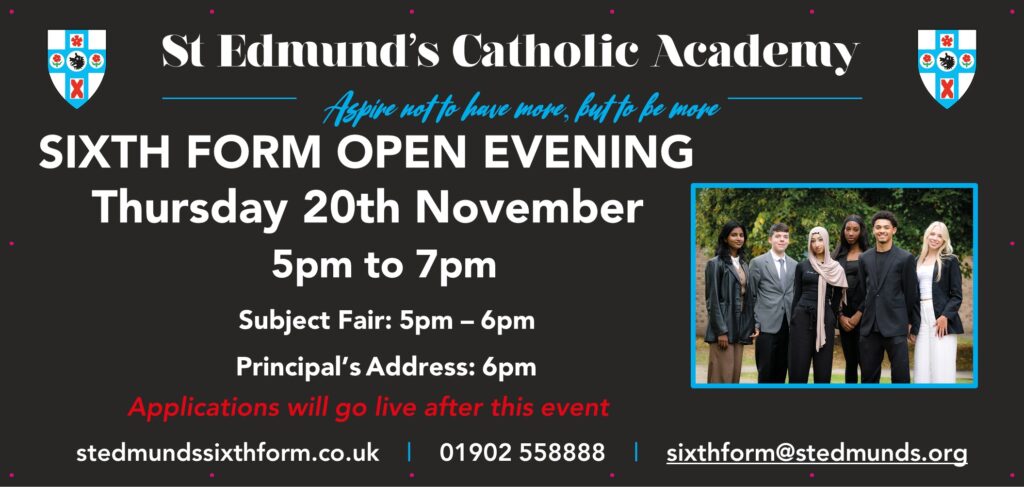 St Edmund’s Catholic Academy maintains an excellent reputation for high quality post-16 provision within Wolverhampton. Our curriculum offer is broad: ranging from traditional facilitating subjects to prepare for Oxbridge and other Russell Group Universities to contemporary vocational subjects leading to exciting careers such as Architecture, Engineering, Business and Health and Social Care.